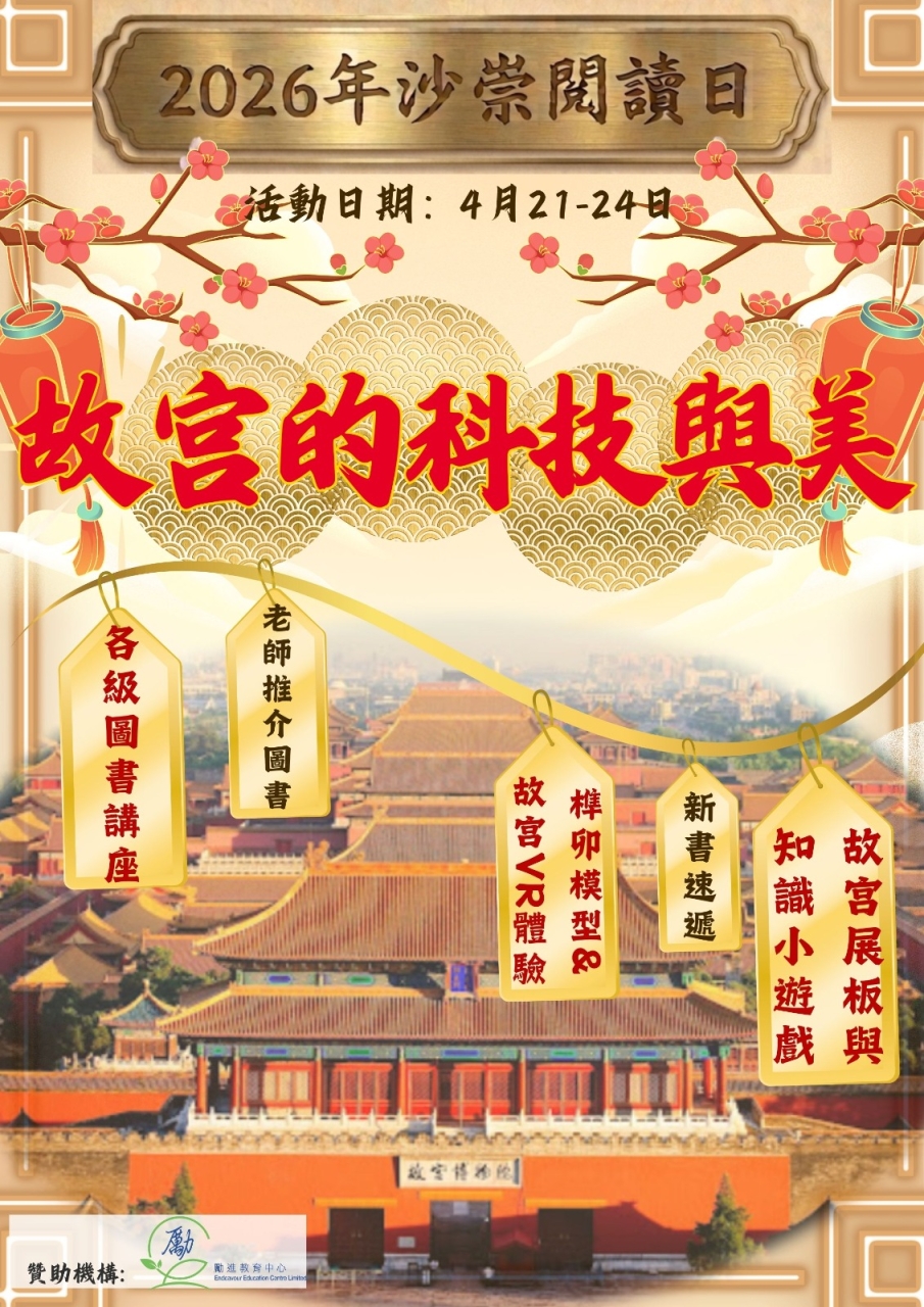 4月23日是「世界閱讀日 」,今年度沙崇閱讀日的主題是「故宮的科技與美」,這星期同學可透過不同活動認識更多故宮。另外,圖書館亦已擺放關於故宮的圖書,歡迎家長與同學一同到借閱。